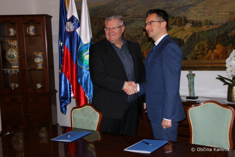 Župan Marjan Šarec je skupaj s predsednikom Podjetniškega kluba Kamnik Alešem Juhantom v Poročni dvorani občinske stavbe podpisal protokol o